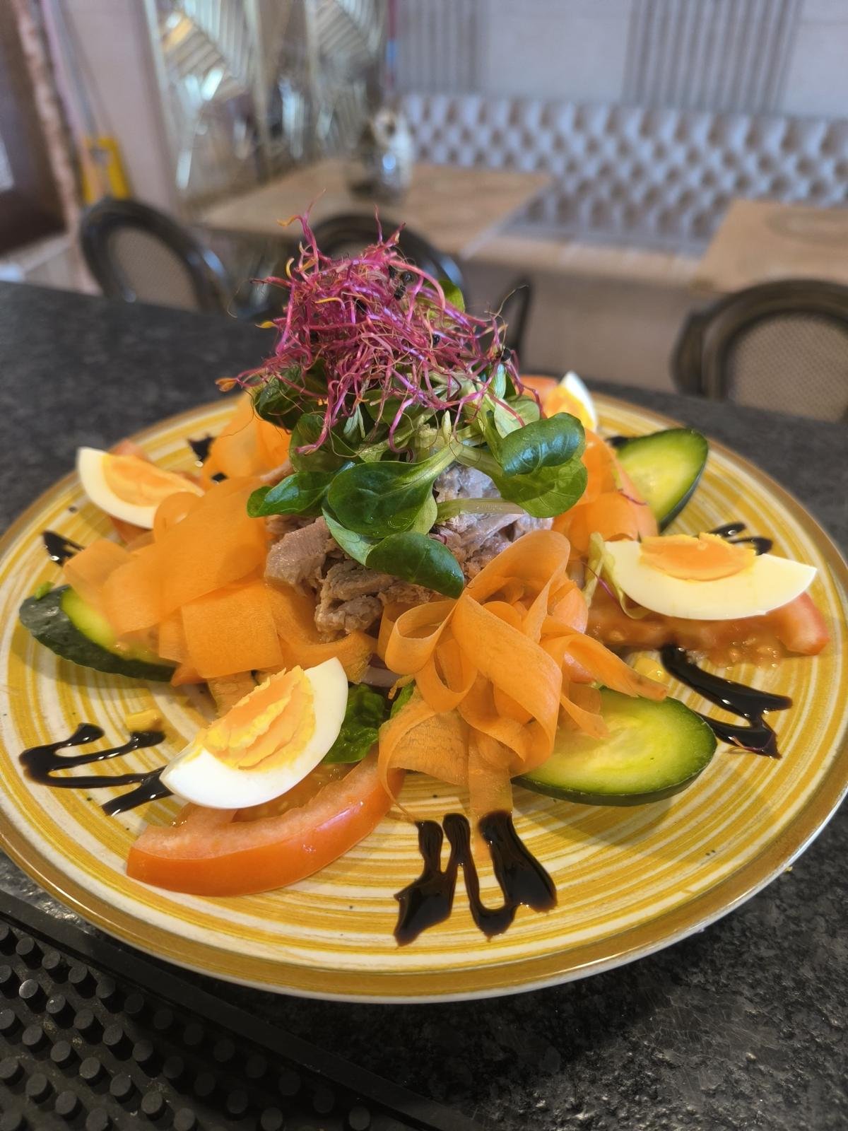 15,95 € Add to cartFresh lettuce topped with sliced boiled egg and slices of ham with onion, cucumber and tomato